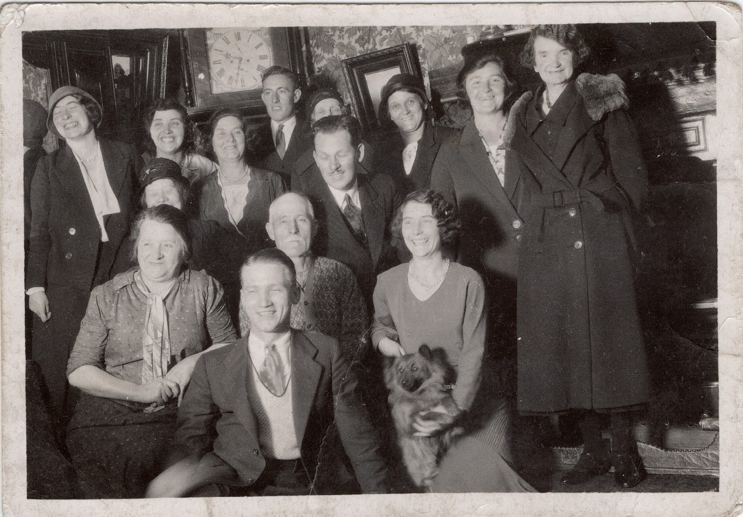 One of those was a small black-and-white photograph of a group of fourteen people in someone’s home. There is a grandfather clock in the background along with a floral patterned wall, photograph frames, and a fireplace. The four men and ten women were dressed formally and it appears that two photographs were being taken at the same time, at 9:20 pm (as per the grandfather clock), as most of the group was looking in one direction and others were staring in the direction of this photograph.