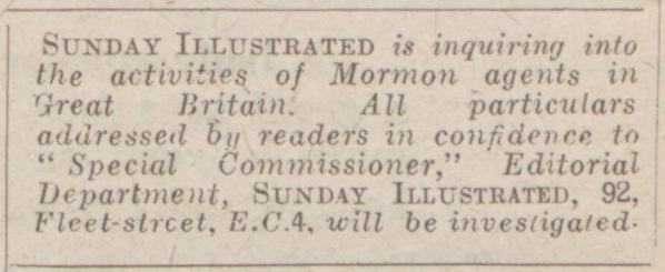 Sensational headlines were utilised to stir interest and to warn of the “menace of Mormonism.” Articles exaggerated the growth of the Church and presented the missionaries and the teachings they shared as dangerous to British society. Taking a page from the American Muckrakers of the time, the Sunday Illustrated brazenly undertook a campaign against the church