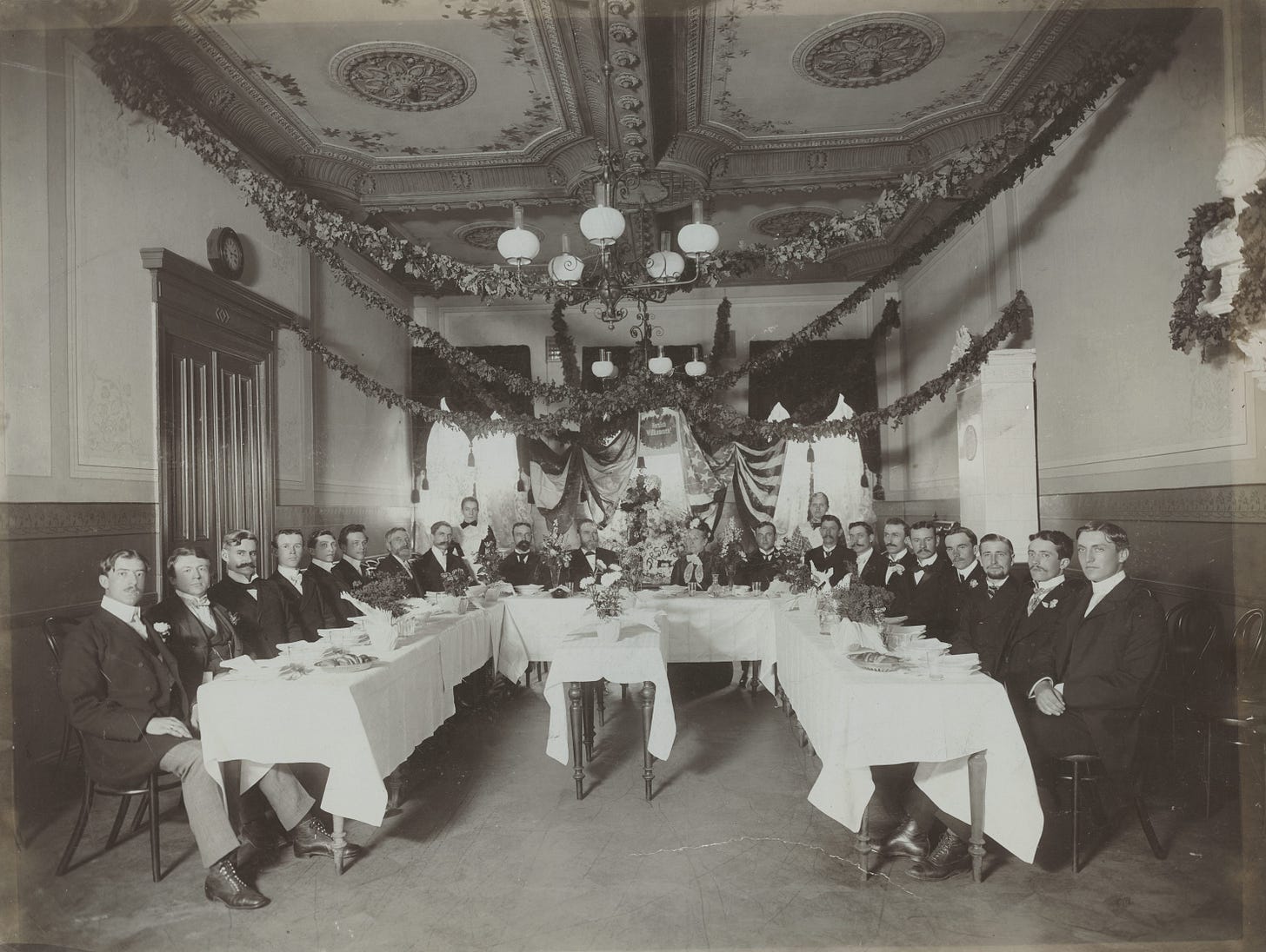 Margarethe watched as the sixteen missionaries serving in Hamburg arose to greet President Lyman as he and the others arrived. Soon after, at 2.50 p.m., the group posed for a photograph to record the occasion. Margarethe and Augusta Näschke stood in the corners of the room along with the Latter-day Saint missionaries and leaders. With a bright flash, the shot was taken and attention could be turned to the fine feast awaiting them.