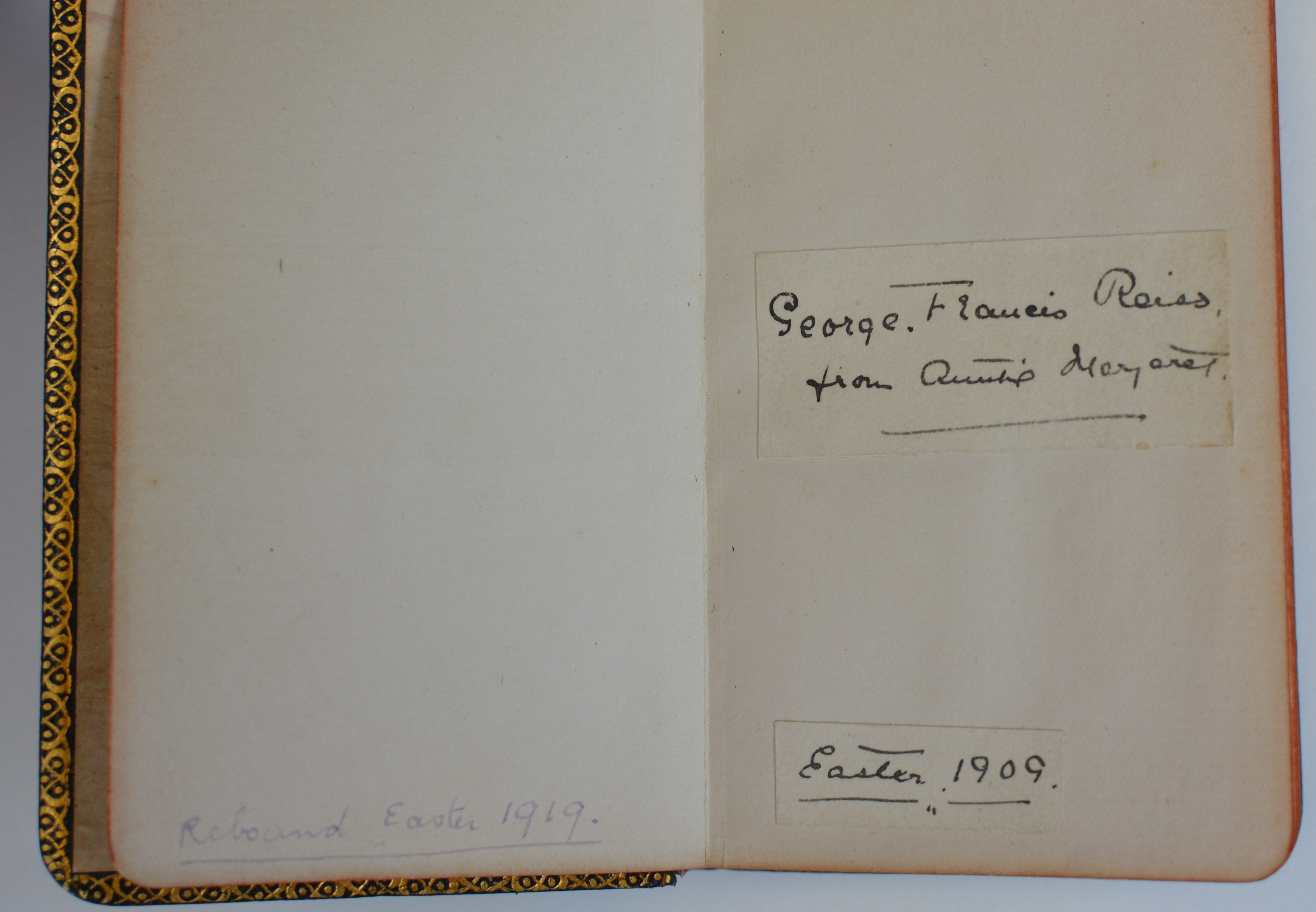 The first Book of Common Prayer was published in 1549 and although it has changed in size, composition, and content, it remains in use within and central to the Church of England. This particular copy of the (undated) book has two pasted inscriptions. One indicates that it was a gift to George Francis Reiss ‘from Auntie Margaret’ with a second pasting at the bottom of the front endpaper indicating it was given in Easter 1909. A further inscription is found on the opposite page which states it was rebound at Easter 1919. The front cover has the initials G. F. R. stamped in gold leaf in the bottom right-hand corner.