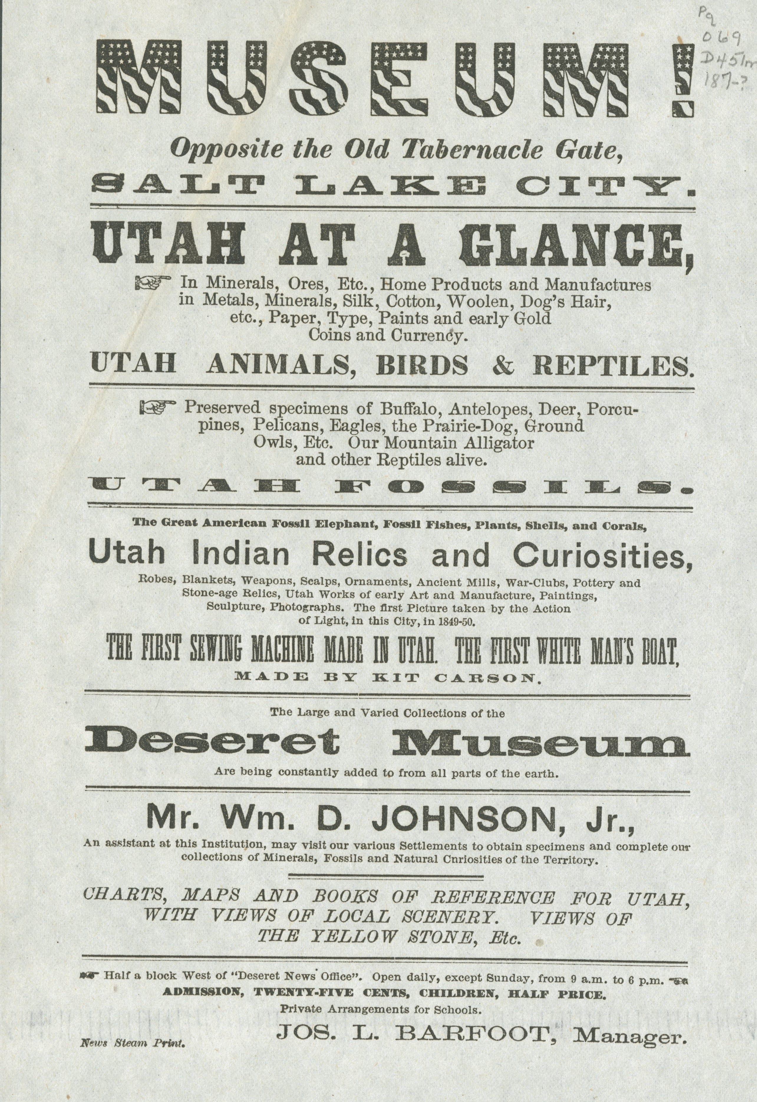 Joseph L. Barfoot, ‘Handbook Guide to the Salt Lake Museum,’ 1881, 069.5 D451h 1881, bx. 1, fd. 1, CHL.