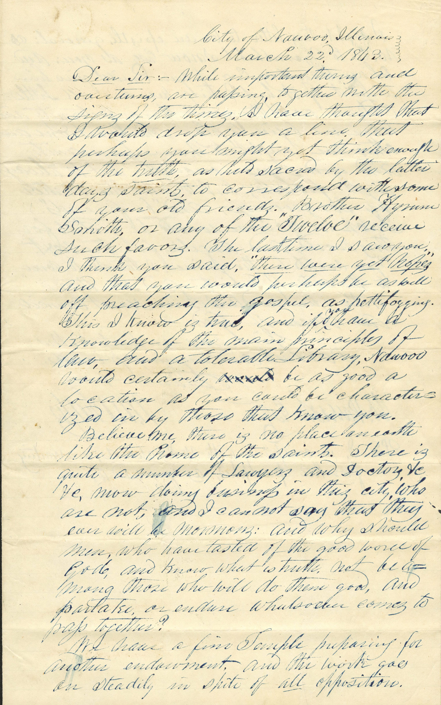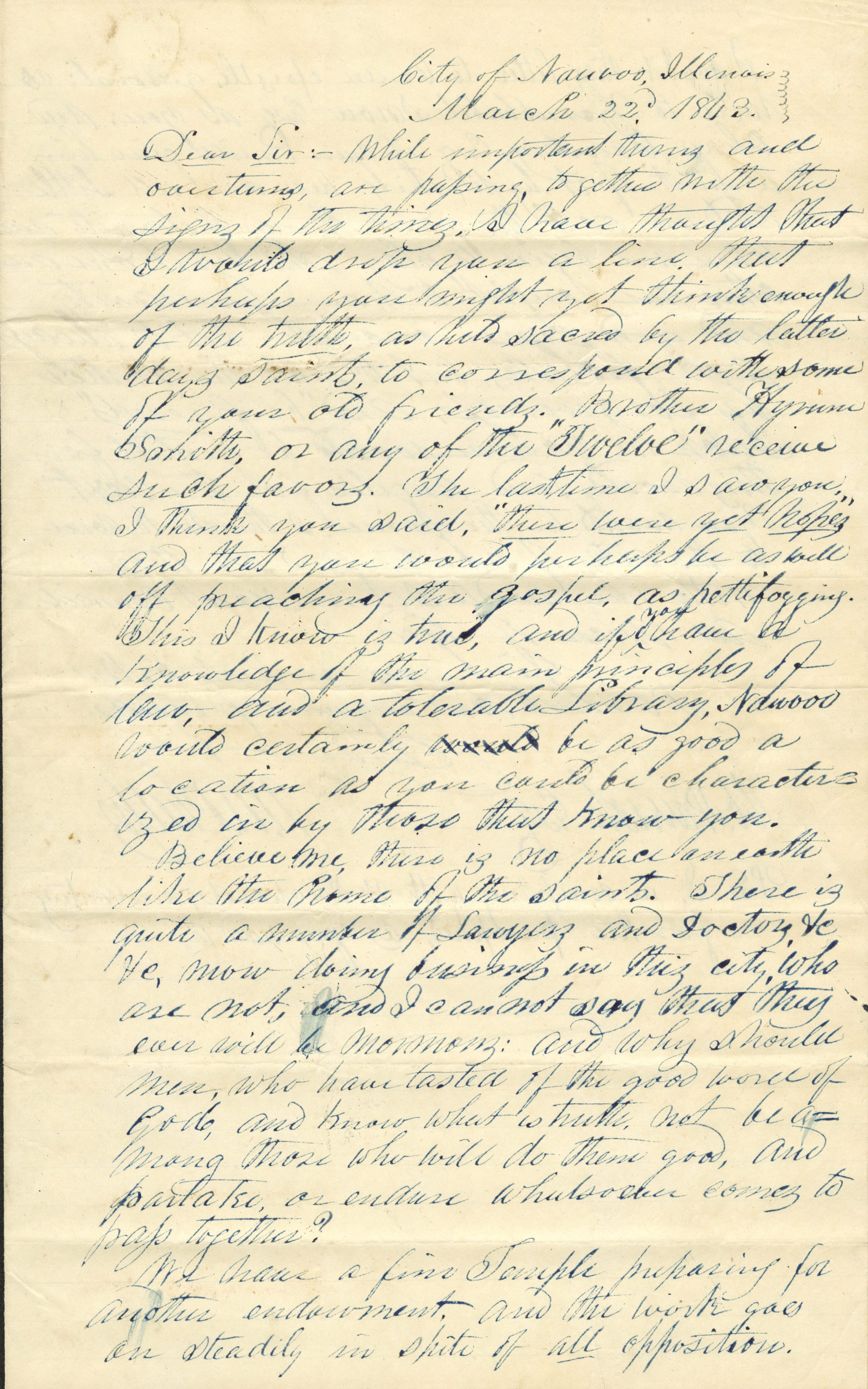 Dear Sir:- While important things and our turns, are passing, together with the signs of the times, I have thought that I would drop you a line. But perhaps you might yet think enough of the truth, as held sacred by the Latter day Saints, to correspond with some of your old friends. Brother Hyrum Smith, or any of the “Twelve” receive such favors. The last time I saw you I think you said, “there were yet hopes” and that you would perhaps be as well off preaching the gospel, as pettifogging. This I know is true, and if you have a knowledge of the main principles of law, and a tolerable library, Nauvoo would certainly be as good a location as you could be characterized in by those that know you. Believe me, there is no place on earth like the home of the Saints. There is quite a number of lawyers and doctors + etc, now doing business in this city who are not, and I cannot say that they ever will be Mormon: and why should men, who have tasted of the good word of God, and know what is truth, not be among those who will do them good, and partake, or endure whatsoever comes to pass together?