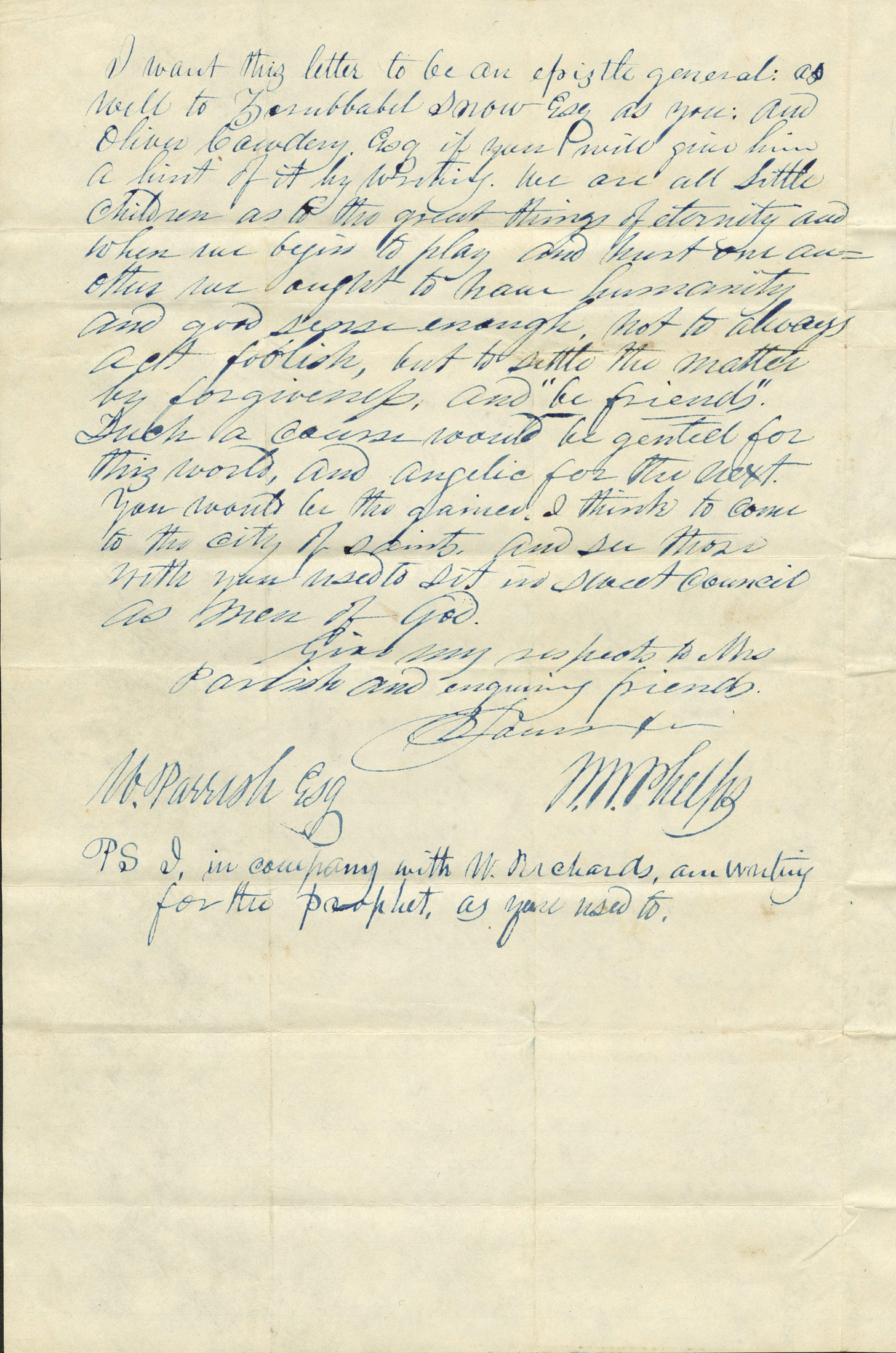 Despite William Phelp’s tumultuous relationship with the Church he reached out with love to Warren and his other acquaintances, including Zerubbabel Snow and Oliver Cowdery who had also left the Church. Phelps makes an appeal to Parrish’s earlier memories and experiences with the Saints. Old acquaintances are projected as being willing to correspond with Parrish and that he would be ideally suited for life in Nauvoo. Phelps also shares news of a temple and indicates that things are progressing for the Saints.